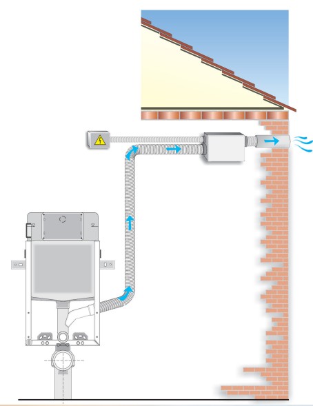 È l’elemento base, incassato a parete si collega al tubo di risciacquo della cassetta di scarico con un flessibile diametro 32 per aspirare all’interno del WC; un flessibile diametro 50 collegato alla bocca di espulsione convoglia i biogas ad una canna di ventilazione o all’esterno ed il bagno resta con aria pulita.